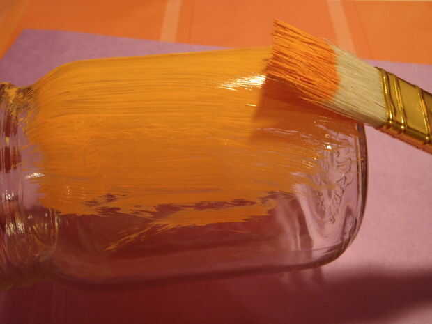 Tomar su pintura naranja y usar su pincel grande y dan su capa uniforme un tarro.