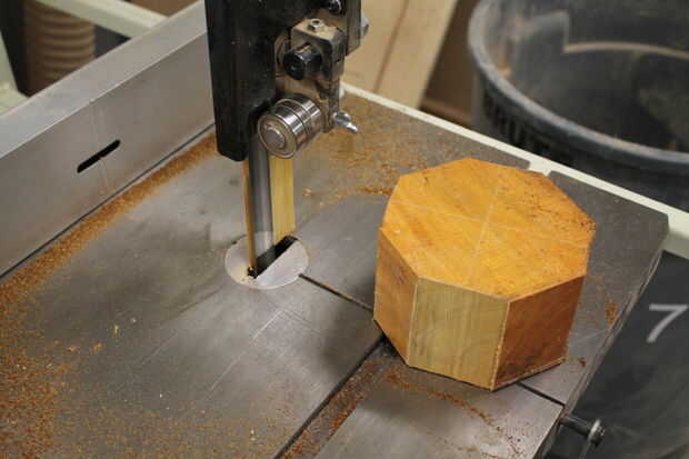 Antes de empezar da vuelta, marca el centro de mi acción y la sierra también corte hasta un octógono. Naranja de Osage es bastante densa y resistente, para cortar a través de 3 pulgadas de la misma fue muy nudosas. Problemas, sólo no tenía que tomar lento.