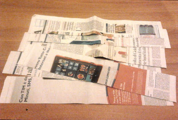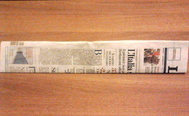 Toma una hoja de un periódico y dóblalo por la mitad 3 veces a partir del lado más corto. Abra la hoja: ahora tiene 8 secciones. Corte a todas ellas y hacer lo mismo con otras hojas para obtener tiras de por lo menos 62 (depende de qué tan grande será su sostenedor de vela).