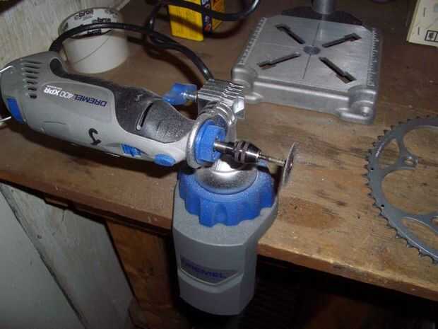 Cortar el plato por la mitad. Usé una dremel montada sobre la dremel multivise para hacer esto.