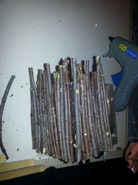 Cuando corté los palillos he hecho para que no fueran la misma altura, pero cerca de la parte superior del sostenedor de vela. Usé un sisors para cortar los palos. Tenga cuidado de algunos palos de tiro apagado cuando se cortan. Intenté utilizar los palitos más directo podría alguna curva, pero eso está bien. No estoy seguro qué tipo de palos usa pero creo que palos muertos ven lo mejor. Asegúrese de que usted reúnen suficientes palos para que usted puede terminar de una vez.