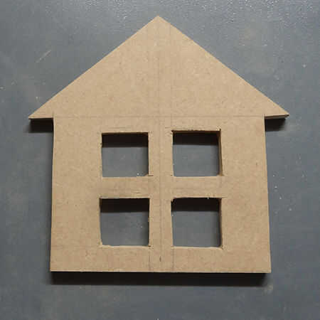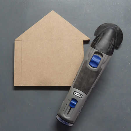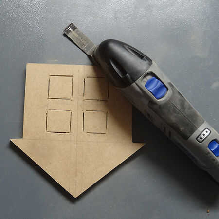 3. dividir el frente en cuartos y medida y marca para cortar las ventanas con un Dremel Multi-Max y corte. Poner el proyecto en un pedazo de pino o madera blanda para proteger la superficie de trabajo.