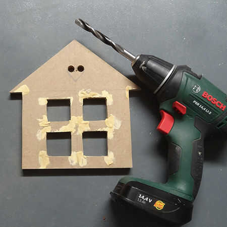 6. en la sección de techo dibuja una forma de corazón y utilice una broca de madera de 8 mm para perforar agujeros para facilitar la forma.