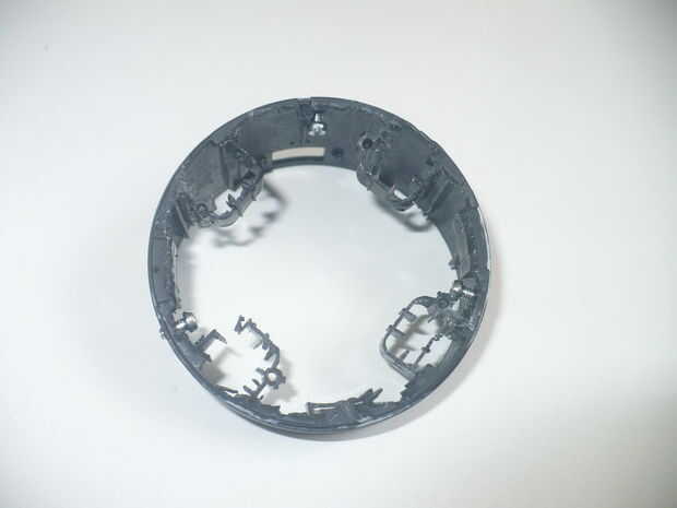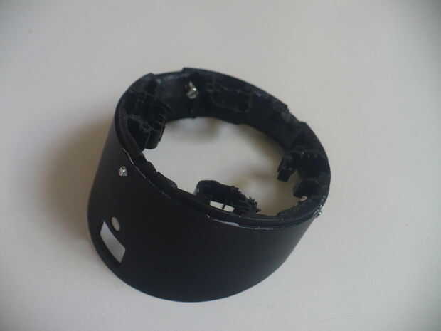 Escoge tres puntos en la caja de las TS (más o menos igualmente colocada alrededor) y marque la distancia previamente medida en él. El punto es que se debe posiblemente compensa los imanes posiblemente que sobresale y el espesor de la goma que se sujetan la bandeja y el anillo de soporte. Los tres puntos deben ser elegidos lo, que usted puede tener acceso a ellos con el destornillador desde adentro en un ángulo más perpendicular a la caja de las TS. Debe perforar un agujero para cada tres tornillos. El agujero debe ser del mismo diámetro o preferiblemente un poco más pequeño que el tornillo. El punto es que el tornillo debe cortar su manera a través de la plástica y debe ser muy apretada. Después de la perforación, después de atornillar los tornillos, asegúrese de que no queda rebabas en la parte exterior y el exterior de la vivienda debe aplicarles.