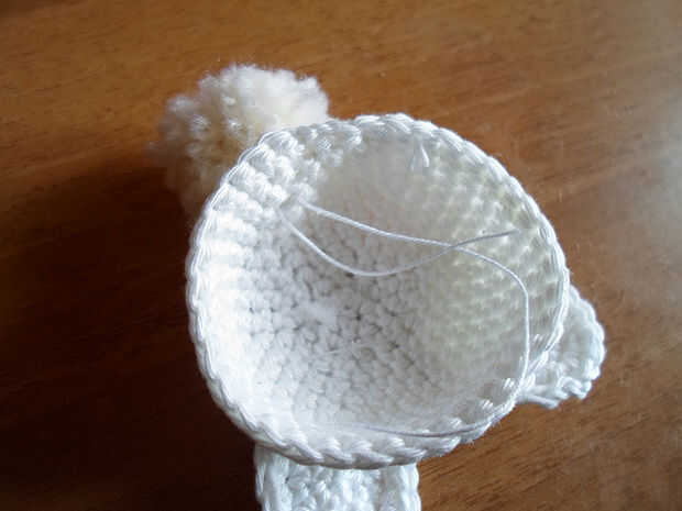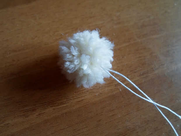 Utilice los 2 hilos para atar la cola de pom pom en la parte inferior haciendo un nudo.
