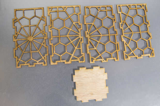 Cortar las piezas utilizando el archivo "Portalápices geométrica". Los archivos se encuentran en .svg y. AI.