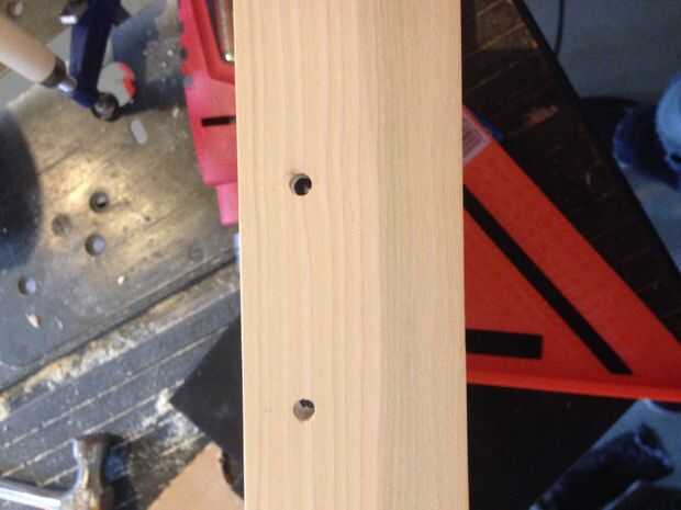 Taladro 2 agujeros pequeños de 2 el 1/2" aparte y misma distancia desde el centro del tablero inferior. Esto se utilizará para atar la pieza de la canalización vertical.