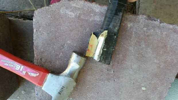 Coloque palanca recortada de su raqueta sobre algo dura y plana, como un ladrillo. Ahora empezar a golpear con un martillo. El objetivo es remodelar el extremo de la manija para que se deslice en el extremo del canal en C. Se puede ver en las fotos cómo mi garrote inicial había descolocado el relleno de plástico, que está bien. En la segunda foto, se puede ver cómo reformuló el mango. Tenga en cuenta que no paso inmediatamente de altura de viejo a la nueva altura. Más bien, cónico el mango que puede ser pegado en el canal C para quedarse.
