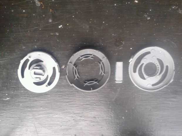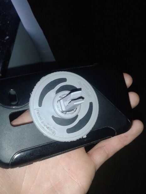 Romper las piezas de conexión de ambientador abajo I deshechos la parte superior (parte gris oscuro) ya que esto era excedente. Corté un agujero en el viejo caso suficientemente grande para que el clip de ambientador para viajar a través.
