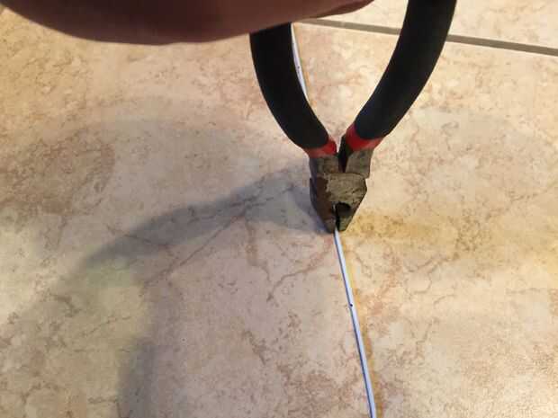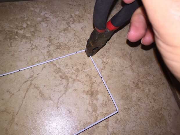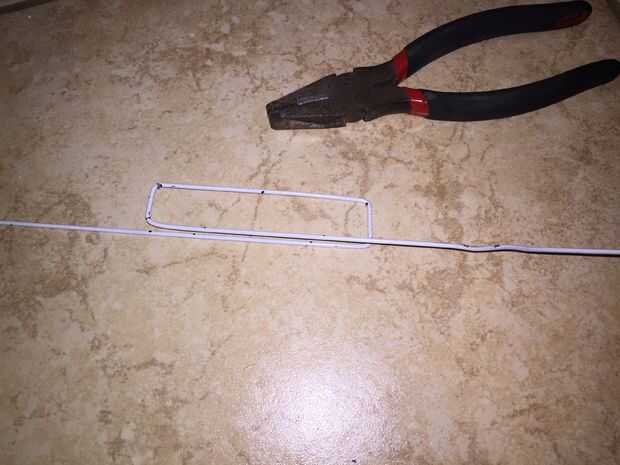 Empezaremos doblando el palmo que se asienta contra la parte posterior del teléfono primero (las dos marcas más cercanas a la marca). El truco aquí es utilizar los alicates con cuidado y mantener el punto de flexión tan firmemente como sea posible, contra las quijadas de los alicates de doblez. Este cable es bastante flexible, pero eso significa que usted tiene que asegurarse que son flexión donde usted quiere. Después de la primera curva, sostener el codo en el cable firmemente al suelo y pellizcar la siguiente curva para que los dos ángulos están en el mismo plano y el cable extra no apunta apagado en dos direcciones aleatorias en el espacio. Cuando haya hecho las dos primeras curvas, debería verse como la segunda foto, arriba.