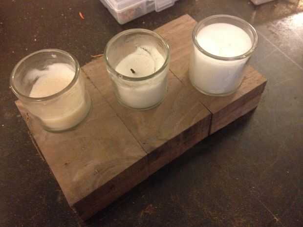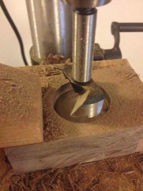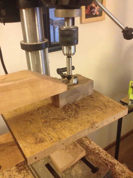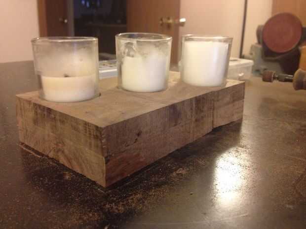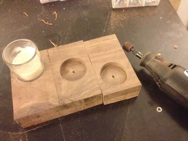 Usé una sierra caladora y Sierra de mano para cortar los bloques sólo porque mis sierras actuaba el momento (y no tengo una mesa de la sierra) Independientemente de lo que utilizas, el seguimiento de todos los dedos. I cortar tres bloques y escalonadas las velas. Las velas son casi 1,75" de diámetro. Yo solía una broca de 1 5/8" forstner y una dremel con un tambor de lijar que haz el agujero del tamaño correcto. Sólo perforé hacia abajo unos 3/8" porque estará cortando un ángulo en los bloques y no desea que el agujero para atravesar la parte inferior.