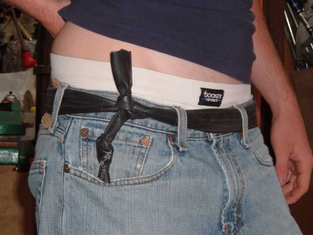 Obtener una cámara de bicicleta (usado) y ponerlo a través de sus lazos de la correa como una correa regular. En lugar de una hebilla del cinturón para conectar los extremos vas a hacer un nudo. Pongo mi nudo a un lado para puntos de estilo.
