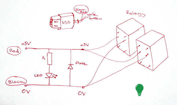El cable USB suministra 5V que encienda los relés. El LED es unform que realmente son 5V en el cable USB y lo tienes conectado en el PC. Tenga en cuenta que el diodo en los + 5V y 0V deben estar allí! Esto tiene que ver con energía "liberada" de los relés cuando la fuente de alimentación está apagada. Este exceso de energía se hará a través del diodo, no a través de su PC.