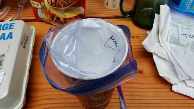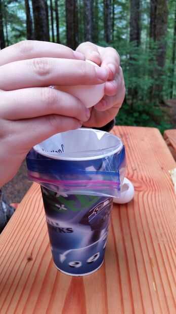 1. Conseguir una taza grande (aquí hemos utilizado una tazas de Seahawks del acoplado). Coloque la bolsa dentro y doblar los bordes sobre el borde. Esto hace más fácil agregar los ingredientes sin mucho lío.