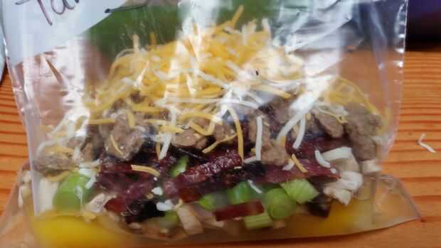 3. Añadir verduras, cocido de carne o queso. Utilizamos cebolla Pimientos dulces, verdes, salchicha de pavo cocido se desmenuza, pedazos de tocino cocido y picado, champiñones y queso rallado. También puede Agregar cosas como: asado de jamón, chorizo, jalapeños, espinacas, aceitunas, camarones cocidos, tomates, queso feta, chiles verdes, maíz, salsa, chili con carne, verduras, etc.. Use su imaginación!