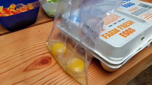 2. Añadir 2-5 huevos dependiendo de qué hambre se encuentre. Se recomienda no añadir más de 5, o no pueden cocinar a través de. Usé dos porque me gusta mucho tocino en mi tortilla.