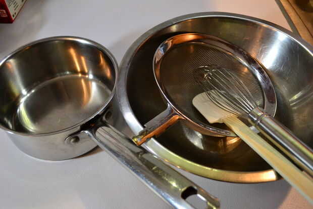 Para prepararlo se necesita: una maceta, un cucharón, un batidor, una espátula de goma, 3 tazones de fuente, un colador.