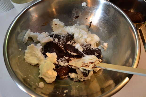 Suavemente doble 1/3 de las claras de huevo batidas en la base del soufflé. Después de que la base se haya aflojado, incorpore las claras de huevo batidas restantes.