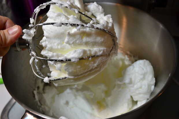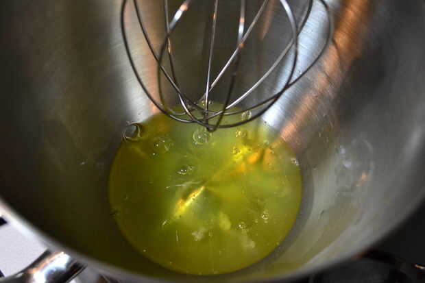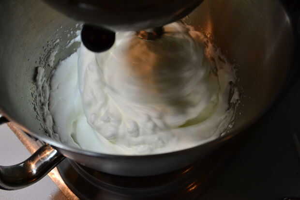 Usando una batidora eléctrica, batir las 6 claras de huevo que salvó de hacer el soufflé de base. Batir las claras a un pico rígido.
