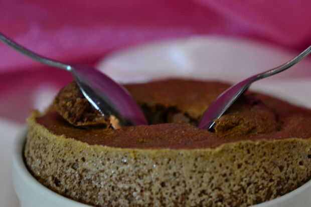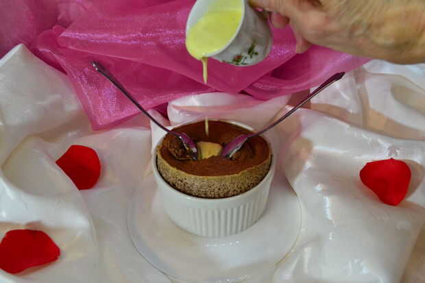 En la mesa, como usted está listo para servir, tomar dos cucharas espalda con espalda y tire suavemente para crear un pequeño agujero en el centro del soufflé. Tomar la salsa de inglesa de Ron Bacardi y vierta un par de cucharadas en el orificio creado.