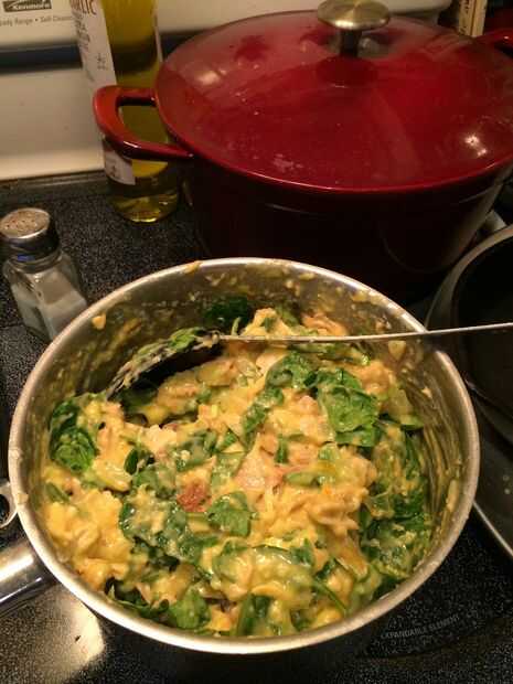 Agregue la nuez moscada y sazonar con sal y pimienta a gusto. Retire la cacerola del fuego y añadir los quesos, luego agregar las yemas de huevo. Ahora mezcla la espinaca, pollo y los cubos de pan. Revuelva hasta que la combinación (mezcla estará espesa).