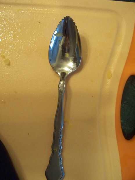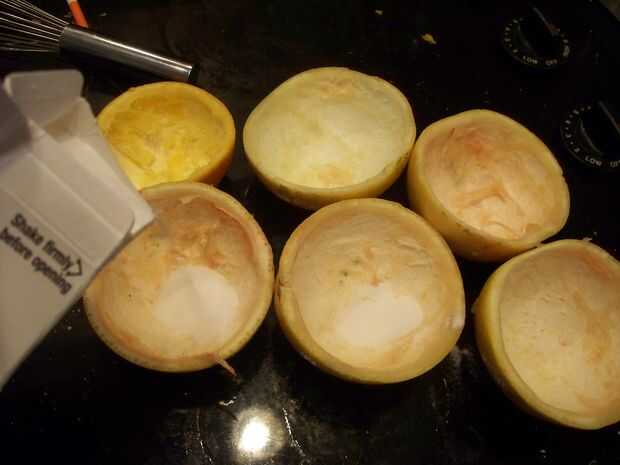 2.) con una cuchara de pomelo, toda la fruta comestible cuchara en una taza, trate de no rasgar la corteza