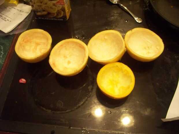 1.) corte la toronja por la mitad (trate de ser lo más preciso posible, va a utilizar la corteza más adelante)