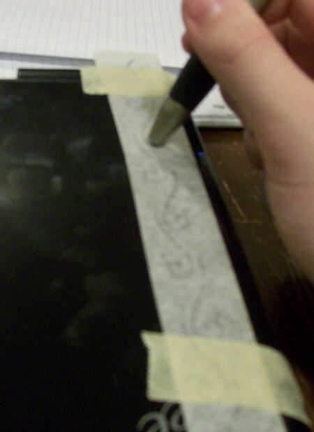 toma su palito (o su cosita plástica o su fantasía lo plástico) y frotar suavemente la parte posterior del papel de calco. Esto transferir el grafito de su lápiz en la tapa y prever una plantilla poco usted trazar sobre en el siguiente paso. frote bien y uniformemente, pero suavemente. Si has trazado la imagen apropiadamente en el ultimo paso, no necesita presionar muy duro en este paso.