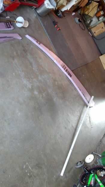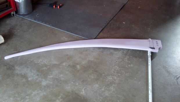 Quería mantener esta construcción barato y ligero. Miré en varios tipos de espuma, pero puesto que la escala de esta hélice debía ser grande, y la persona que lo era una muchacha de 14 año de edad, quería ser como la luz un posible. Me decidí por usar color rosa hojas de espuma de aislamiento porque son muy ligeras y baratas (una hoja de 4 x 8 era aproximadamente $25,00 en mi ferretería local de caja grande). La guadaña tendría que sobre la persona que, por lo que la hoja fue hecha apenas tímida de 4 pies de largo y se une a un 8 pies largo 3/4" PVC poste con una sección más grande diámetro superior e inferior para la estabilidad de la torre.