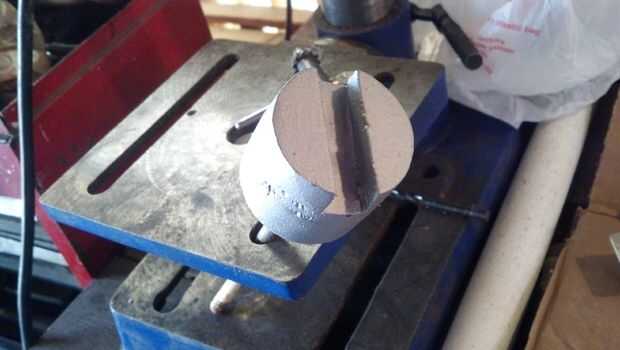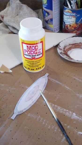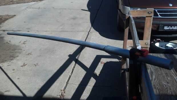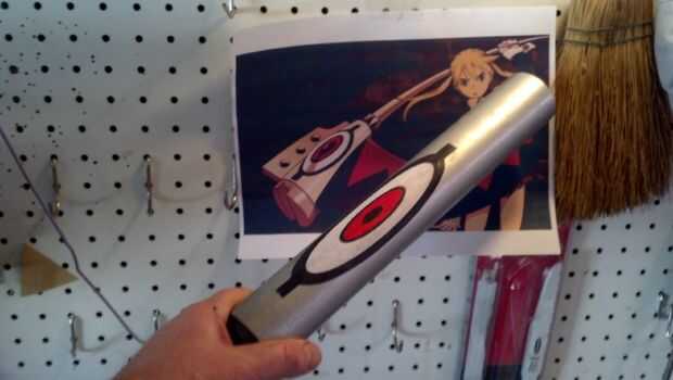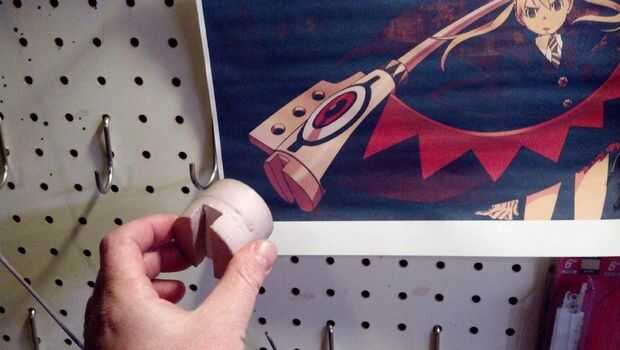 Usé una sierra y cortar dos círculos de 1.5" de espuma rosada y con un cuchillo caliente de la espuma (disponibles en tiendas de hobby) corta la parte superior de personal para que coincida con la imagen de anime que me dieron. Fue mod podged, plastidipped y luego pintado con una plata de Krylon flat. Se fue cortado entonces el espesor correcto y caliente pegado a la parte superior del personal.