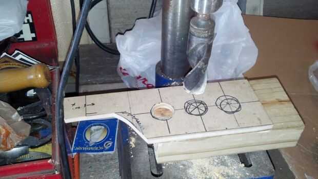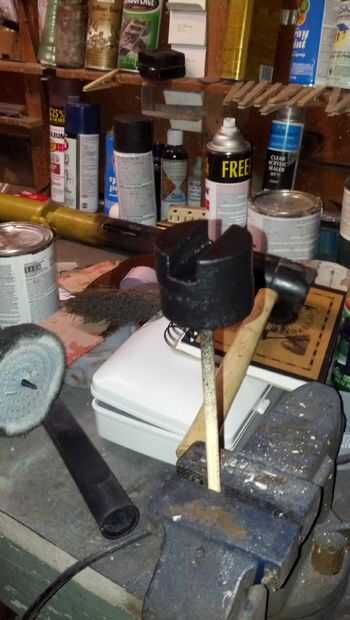 El talón tiene un grande metal (hacha casi como) sección. I corte de MDF (tableros de fibra de densidad media) de 1/4" y utiliza un muy viejo 1" broca para cortar los orificios de 3 ventilación (no pude encontrar mi brocas paleta!). Fue pintado piso de plata, entonces golpeó con varias capas de claras, luego 2 capas más de plata para cubrir correctamente. Él se angustió un poco después con un lavado de negro. Fue atado para el adorno personal con epoxi 5 minutos.