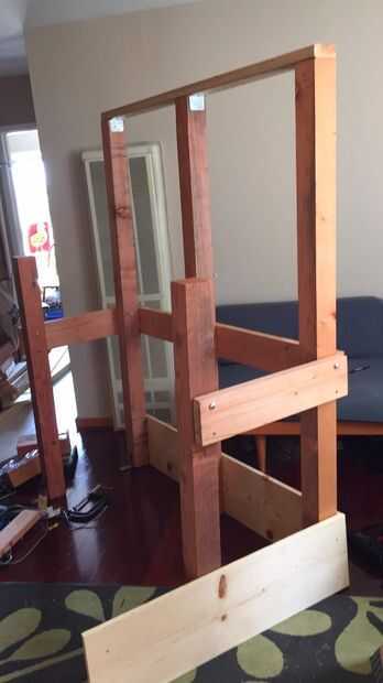 TRONO el trono era mucho más complicado, como necesario para mantener el peso y no volcar. Fue construido en una base de madera contrachapada con alrededor de 250 libras de sacos de arena bajo el paso frontal. Consistió en una pared trasera, asiento, paso/frente y lados. Uno de los lados fue montado con bisagras para que pudiéramos almacenar cosas dentro el trono durante el festival.