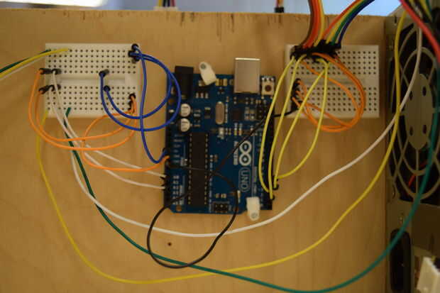 Una vez hecho eso protoboard se tiene que el otro. Mismo pasa aquí, sólo tienes que seguir el esquema de Fritzing y tendrás éxito. La codificación de color de los cables dejando la placa se corresponde con las unidades reales que he añadido en las fotos. Sólo tienes que seguir éstos y debe ser un paseo por el parque para conectarlos. ¡ No olvides los pequeños puentes que se muestra en las fotos!