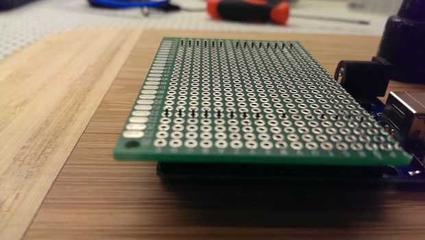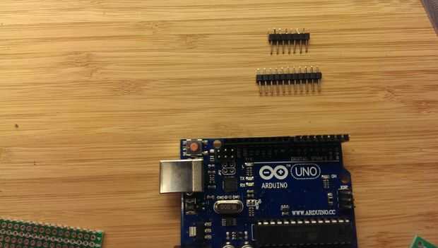 El Arduino UNO tiene una característica donde una fila de pines (A0-A5) no está alineada uniformemente con el lado opuesto de la Junta para que tenga que ser un poco creativo y algunos de los pines del cabezal de la curva para que Alinee correctamente antes de soldar en la placa del escudo.