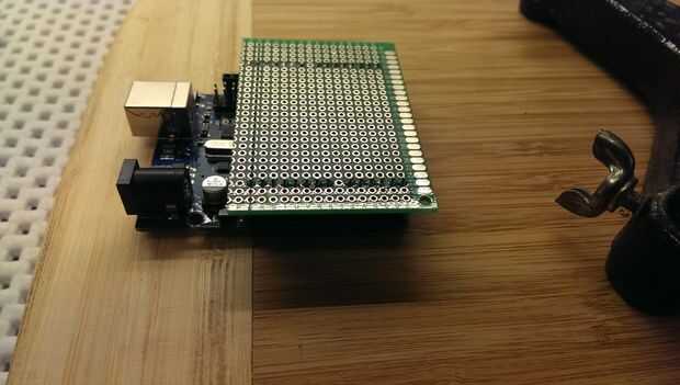 Utilizando un cúter cortar el tablero protector a un tamaño de 20 x 30 agujeros para cubrir los pernos que vamos a utilizar. Corte los pasadores de cabecera tamaño y empuje en la placa Arduino UNO en la posición correcta según el diagrama del circuito. Luego empuje los pernos del jefe en el escudo a colocar las clavijas en los agujeros correctos según el cuadro anterior. Una vez que estén en posición de Solde los pines en el escudo.