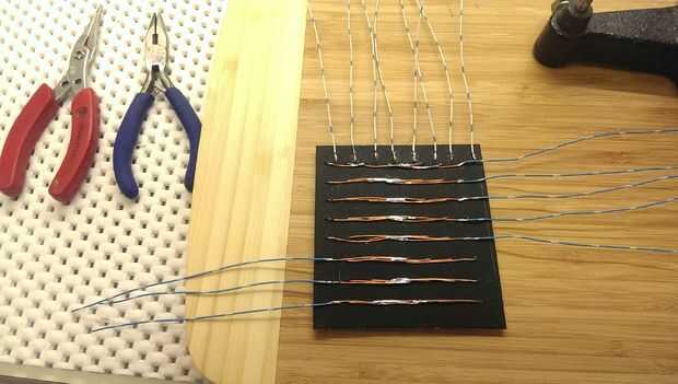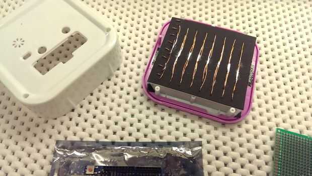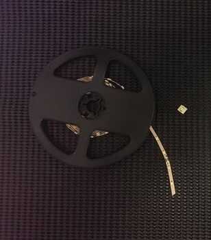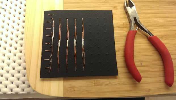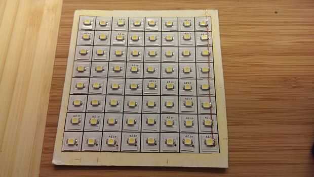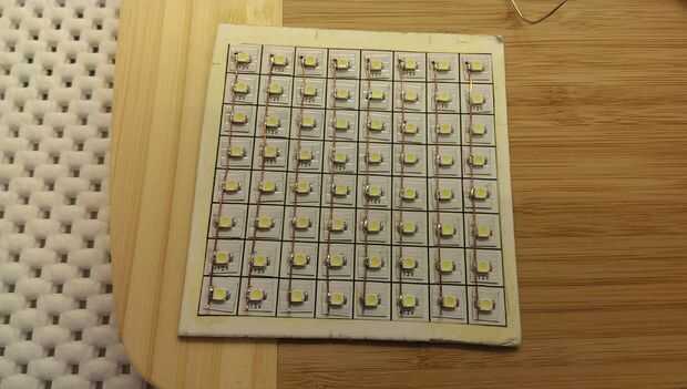 En el ejemplo utilicé alta intensidad superficie blanca monta LEDs que corté de una tira de LED de 3v. El punto clave es que unan el cátodo (-ve) de cada LED de cada fila horizontal junto en un lado de la cartulina. Luego atraviesan el ánodo (+ ve) al otro lado de la cartulina a través de un agujero y cada columna se unen en ese lado. Lo que usted termina con es 8 tiras de cátodo en un lado horizontal y ánodo 8 tiras en el otro lado verticalmente.