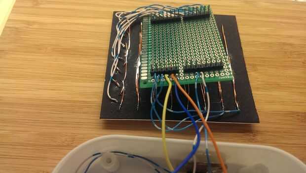 Conecte el tablero LED el escudo según el diagrama del circuito. Cortar un cuadrado de lámina de plástico para proporcionar un aislamiento entre el blindaje y la parte posterior del tablero de LED para evitar cualquier cosa que ponga en cortocircuito. Ver foto de arriba.