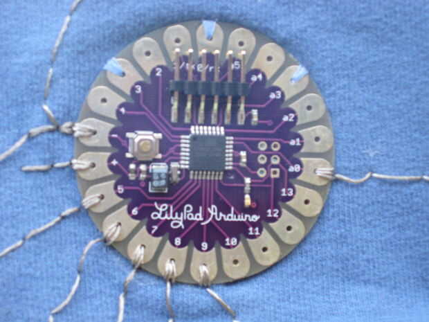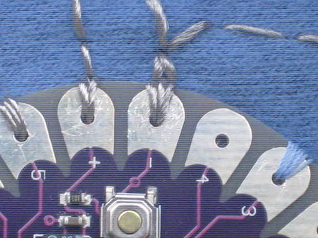 Si encuentra que su Lilypad no se asegura completamente en su ropa, puede utilizar el mismo método de cosido con un hilo no conductor que coincida con su tela y bucles a través de los orificios de los pétalos sin usar de LilyPad de la puntada. He incluido una foto abajo - esto se debe ver similar a la costura de hilo conductor.