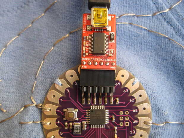 Para programar tu chaqueta, pegue el código anterior (o escribir su propio código) en la ventana de Arduino y cargarlo en el LilyPad. Si usted no está seguro de cómo programar el LilyPad o si el código no tiene ningún sentido, Leah Buechley tiene algunas grandes instrucciones aquí.