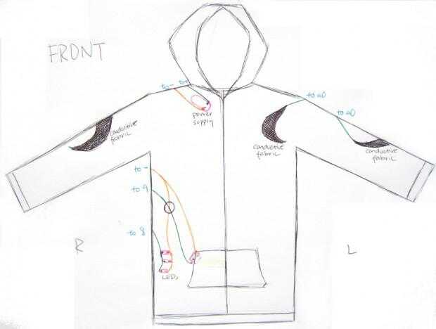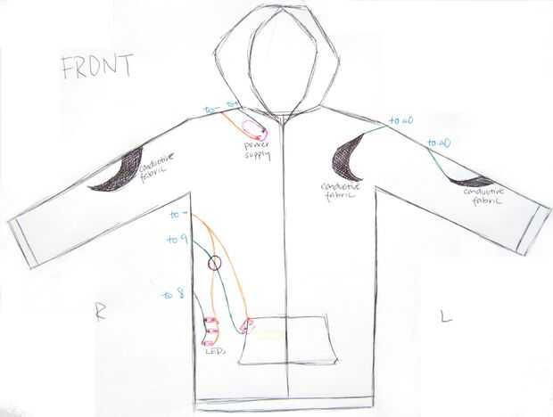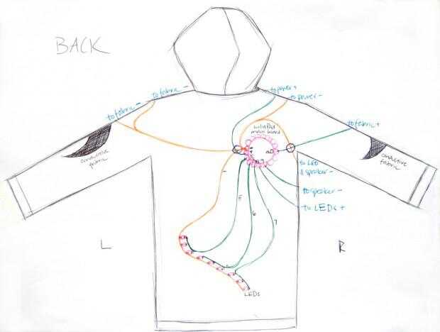 Cuando usted pone sus manos en el tejido conductor de la prenda, el programa detectará que se ha completado el circuito, y se encenderán el LED y el altavoz. Presenta la tela conductora en mi sudadera con capucha en lugares convenientes (brazos, codos, hombros) que mis manos podrían descansar en forma natural, por lo que colocar mis manos para completar el circuito no causa tensión.
