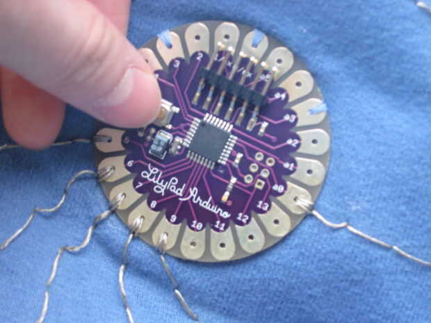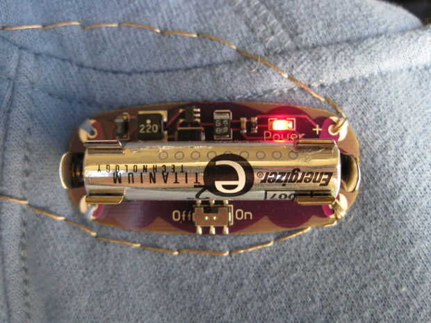 Si la luz roja está encendida, presione el botón del interruptor en el tablero principal de LilyPad. La luz el LilyPad debe parpadear cada vez que pulse el interruptor. Si no, la resistencia entre la alimentación y el LilyPad es demasiado alta, y debería reforzar la costura.