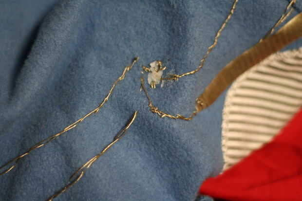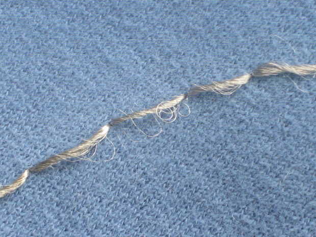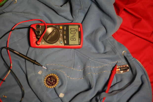 Hay dos maneras de reforzar la costura. Si la resistencia está apenas por encima de 10 ohmios, puede reforzar utilizando hilo conductor más. Sin embargo, si la resistencia es extremadamente más alta (mayor de 50 ohmios), puede reforzar utilizando tela conductora, que tiene mucho menor resistencia que el hilo de rosca. Para ello, corte una tira de tela conductora y hierro en la parte posterior de la prenda que ambos extremos de la tira son tocar el camino de la puntada. Luego, hacer varias puntadas de hilo conductor de su trayectoria original y coser sobre el tejido conductor (para que las puntadas que usted está haciendo son encima de la tela conductora (ver foto más abajo)) para que el hilo y la tela están conectados. Repita para el otro extremo de la tira. Esto debe reducir considerablemente su resistencia.