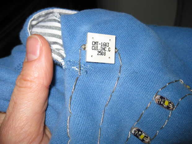 Utilizando las mismas técnicas que con los LEDs y otros componentes, coser el altavoz sobre la prenda. Con el altavoz que utiliza, el + y - pétalos no importan, pero si usas un altavoz diferente, asegúrese de prestar atención a que es que. La + pétalo debe conectarse a uno de los pétalos numéricos de la placa principal de LilyPad (utilicé pétalo 9) y el - pétalo debe conectarse el - pétalo de la placa LilyPad.