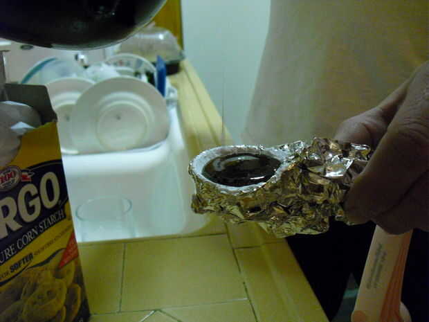 Una cucharada con papel de aluminio y prensa el almidón de maíz dentro de la línea para hacer un molde.  Vierta los ganaderos jolly derretidos a medio camino encima del molde.  Caída de una ojiva en el medio y cubierta con fundido jolly rancher.  Coloque en el congelador durante aproximadamente media hora o hasta que el caramelo esté duro.