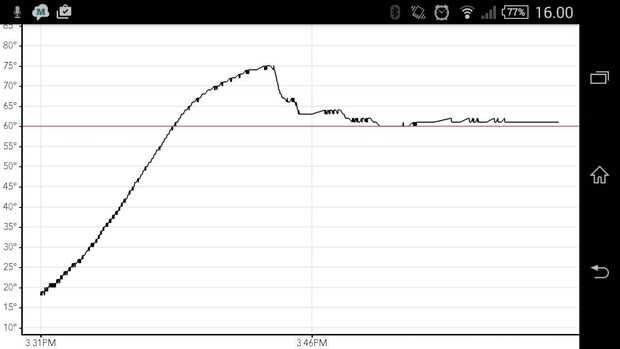 Tengo una placa de cocción con un máximo de 2000watts, pero como se puede ver en el ejemplo lanzamientos camino pasado la 60degrees hasta 70, antes de instalarse en los 60. Así que utilice una cantidad de vatios más moderada - esperaré un poco más que calentar - pero debe resolver más rápido.