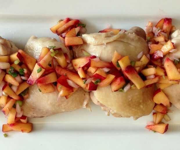 Nota que la piel de pollo es unappealingly pastosa y encharcados, pero aún delicioso. En vez de terminar de pan crujiente y color de la piel, vamos a sacar la manera perezosa y cubrirla con una distracción topping de salsa de nectarina. Prometo que nadie notará la falta de pan acabado en todos los colores brillantes y sorprendentemente húmedo pollo y sabores de la fruta.