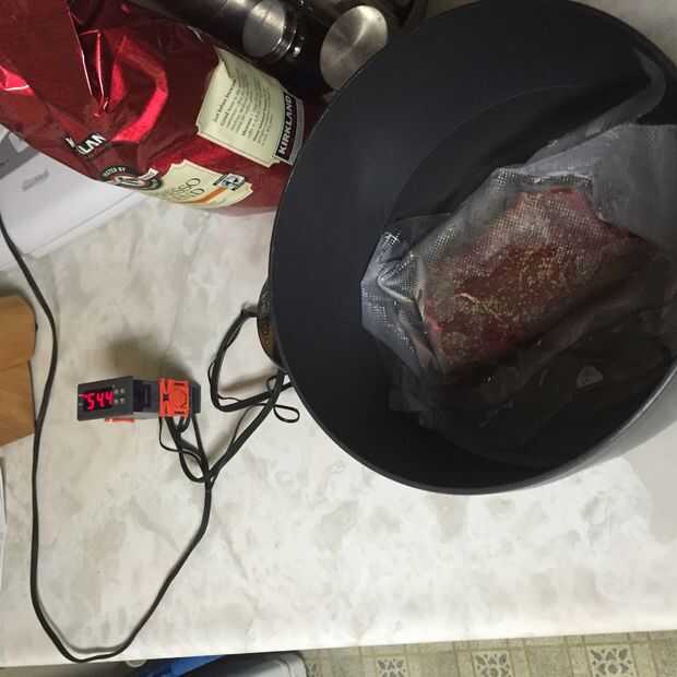 Enchufarlo y probarlo. Si enciende y apaga el controlador PID, probablemente funcionen bien. Cocinar un trozo de carne en él. 56° C o 135° (F) es perfecto. Tarda aproximadamente una hora para conseguir un bistec congelado hasta la temperatura y si es un corte más duro usted querrá salir en la noche a la mañana. Una vez que era confidente que estaba trabajando bien, pongo el regulador de PID en la caja de un proyecto plástico y ahora la usamos casi cada vez que cocinamos.