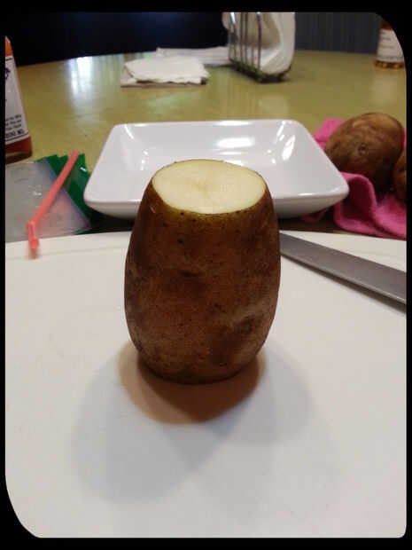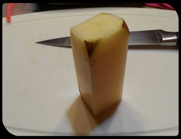 Después de bien lavado y fregado de las patatas, cortar los extremos y posición vertical en una tabla de cortar. Haga cuatro cortes en vertical, de la manera la patata en un rectángulo de altura. Se significan para evocar antiguos megalitos, así que no hay que ser prolijo o perfectamente recta. Asegúrese de guardar los restos para brocas de yummy "escombro".