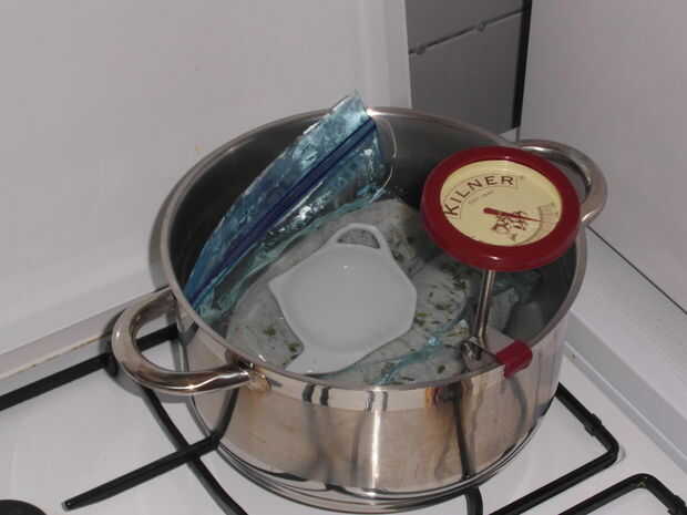 Mientras está en la nevera, tomar una sartén grande y llenarlo con agua hirviendo y luego tomar la temperatura hasta 60 grados Celsius (Fahrenheit de 135).