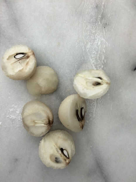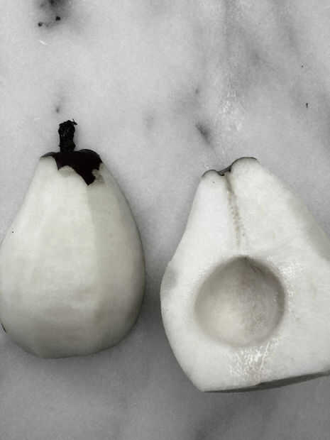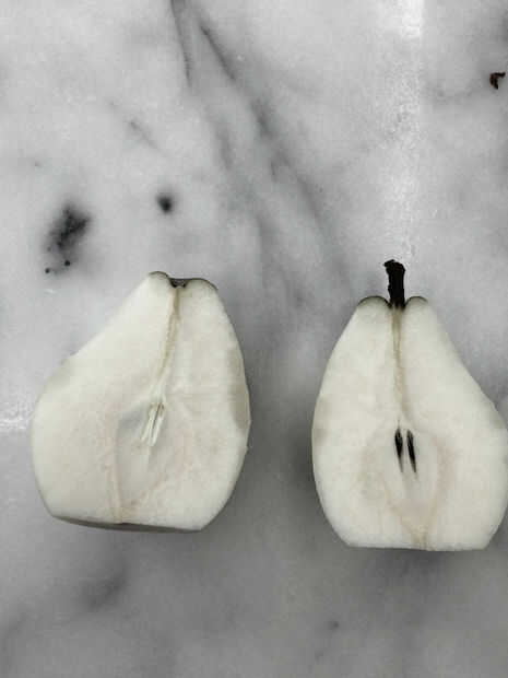 Llenar y precalentar la máquina SousVide y precaliente a 175F / 70C. Pelar, núcleo y reducir a la mitad las peras.